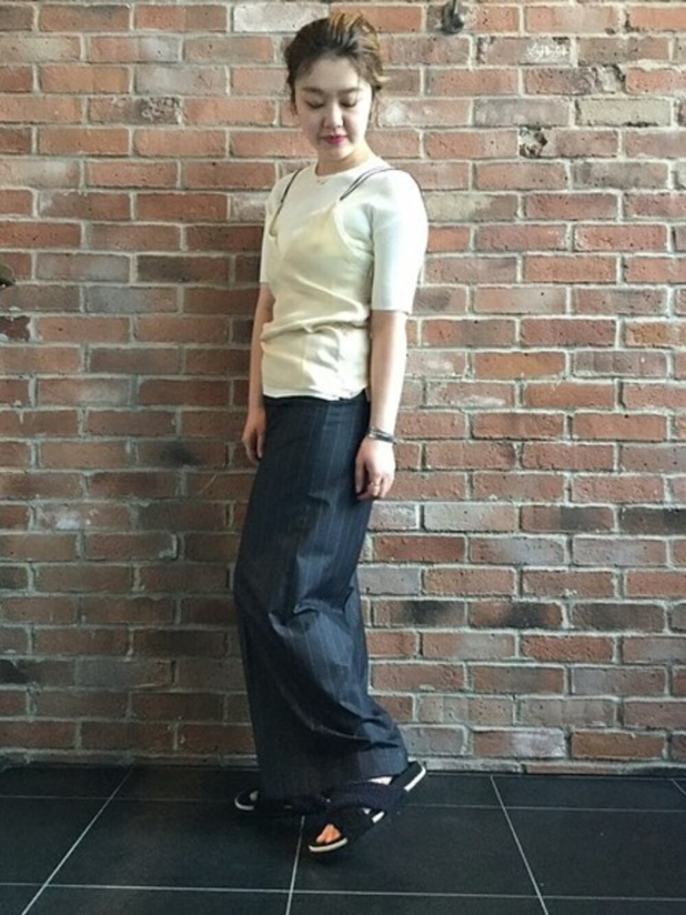 どのアイテムとも相性の良いピンストライプのワイドパンツにトレンドのキャミソールを合わせたスポーティーMIXコーディネートです!