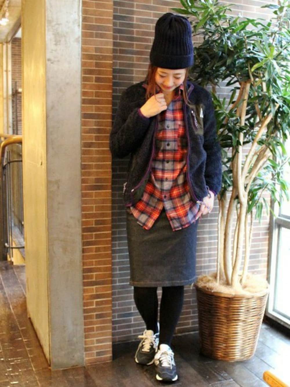 メンズライクなオーバーサイズのネルチェックシャツをタイトスカートとバランスよくコーディネート!フリースブルゾンを羽織ってレイヤードを楽しんで◎