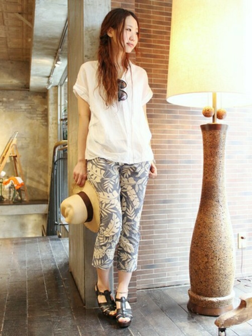 夏らしいリーフプリントのパンツをメインにしたスタイリング! すっきりとしたシルエットながらウエストにゴムが入っているので、着心地も◎ トップスにはシンプルなシャツを合わせた大人なリゾートスタイルです♪