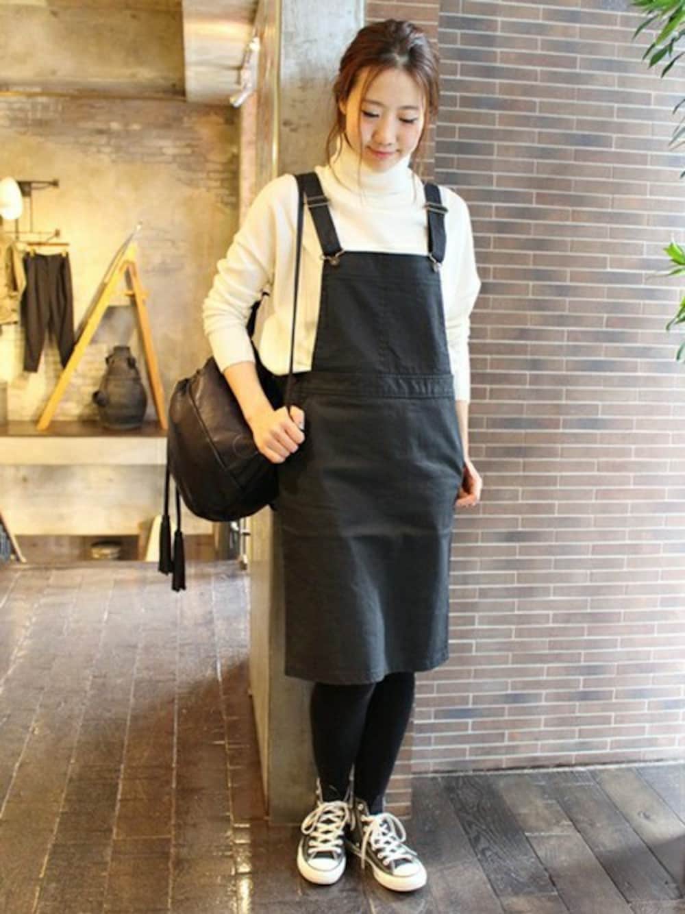 フェイクレザーデニムのサロペットスカートは、マットな質感が大人っぽい印象◎タートルネックのニットと合わせて今年らしいスタイリングの完成です!