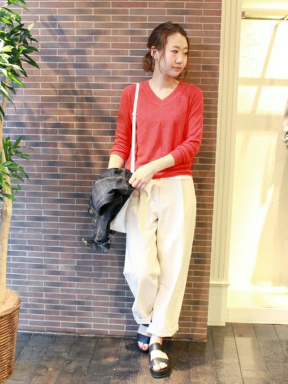 爽やかなアイボリーが春にぴったりのワイドデニムが登場!ルーズなシルエットがポイントのパンツは、すっきりとしたVネックニットと合わせてバランスを◎