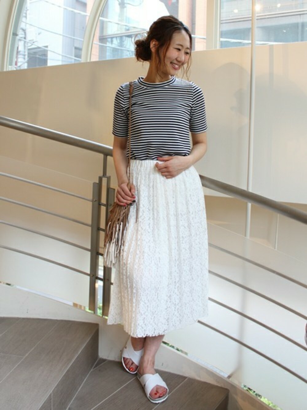 今年注目のレーススカートは、JOURNAL STANDARD L'ESSAGEらしくモードなデザイン!ハイネックのボーダートップスをインして、足元はスポーツサンダルで合わせたMIXスタイルがオススメです◎