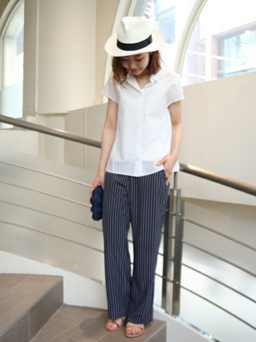 雑誌「otonaMUSE」とのコラボパンツにショート丈のシャツをあわせて。 ハットとエレガントなフラットサンダルで大人マリンなコーディネートに仕上げました。