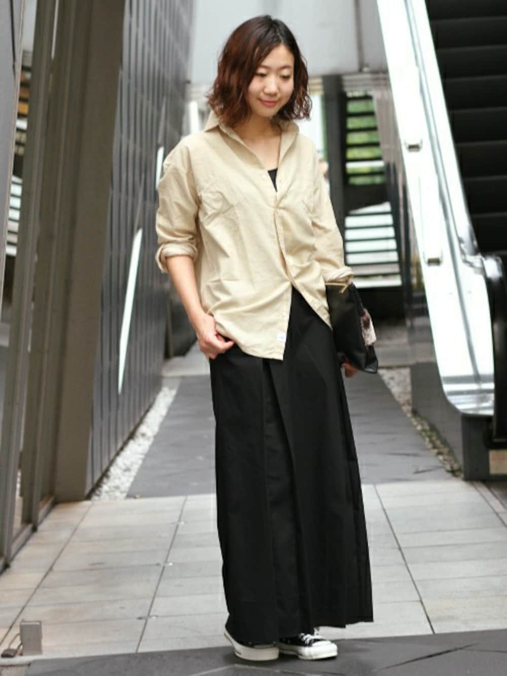 秋のスカートスタイル。 秋の着こなしにぴったりなコーデュロイ素材を使用したシャツ。 こなれ感のあるBIGシルエットで、程よくルーズな着こなしもおすすめ。 マキシ丈スカートと合わせた、旬なカジュアルスタイル。