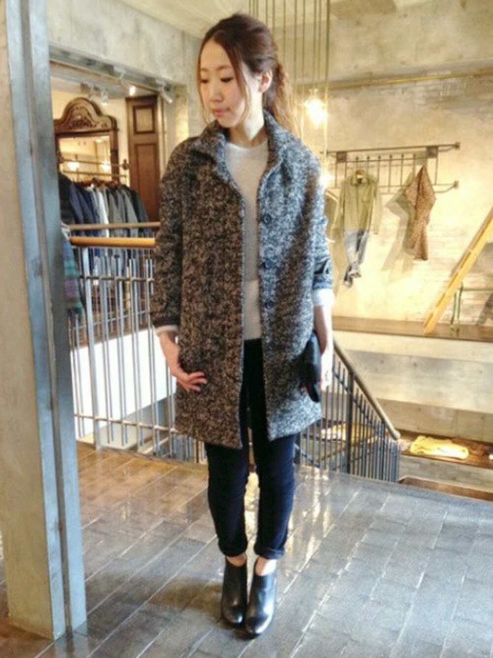 今年流行のドロップショルダーのビックシルエットコート。 ヘリンボーン素材が上品な仕上がりに。 さらりと羽織るだけで、大人なこなれた感を演出してくれます。
