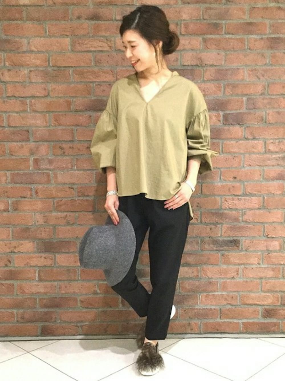 1枚で今年らしい着こなしができるブラウスです! 定番のテーパードパンツとシンプルにコーディネートしてみました。 ゆったりした袖のデザインがポイントです。