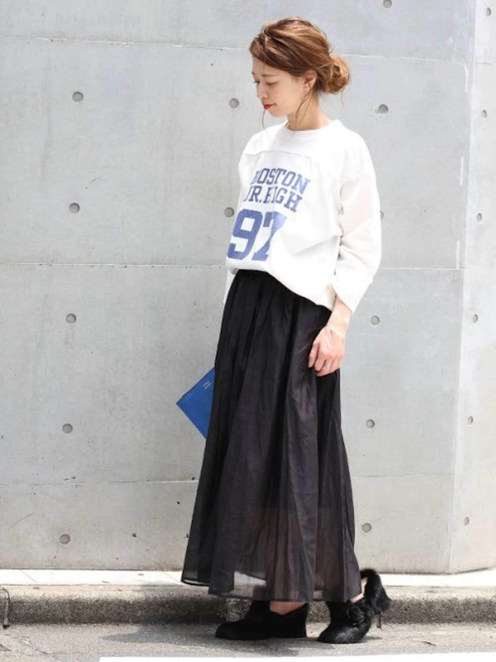 シックで大人っぽいオーガンジーギャザースカートをCHAMPIONのロゴTシャツでカジュアルに落とし込んだスタイル。 足元はファーブーティで秋冬テイストをプラス。