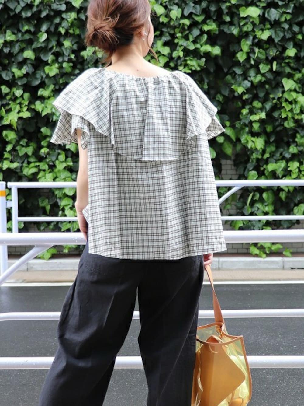 MLMのフリルブラウス。 甘くなりすぎないようにカジュアルなスラックスパンツに合わせて。