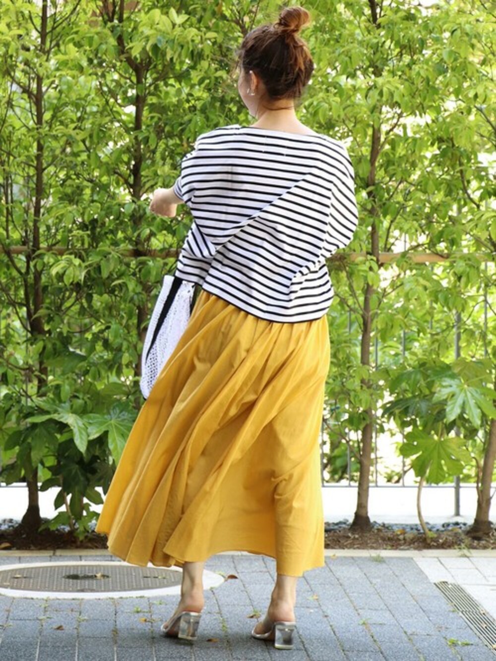 キレイ目スタイルにはメッシュトートでスポーティーさをプラス!足元には今シーズン注目のクリアサンダルを合わせて。