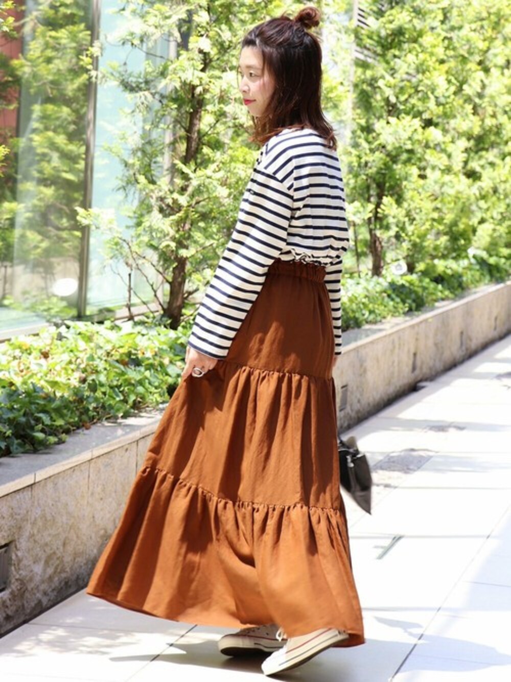 毎シーズン大人気の【Leminor/ルミノア】ボーダーカットソーから長袖が登場!ふんわりとしたマキシスカートに合わせたトレンドスタイル。