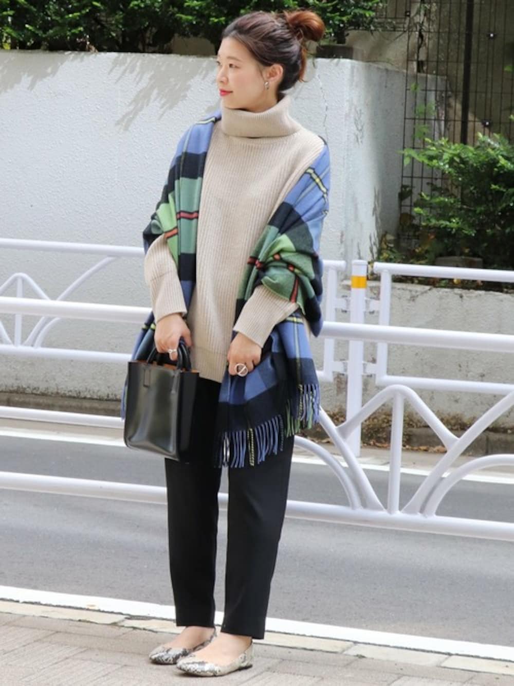 後ろボタンがポイントの畦タートルニットが登場! チェックストールをプラスして華やかに。