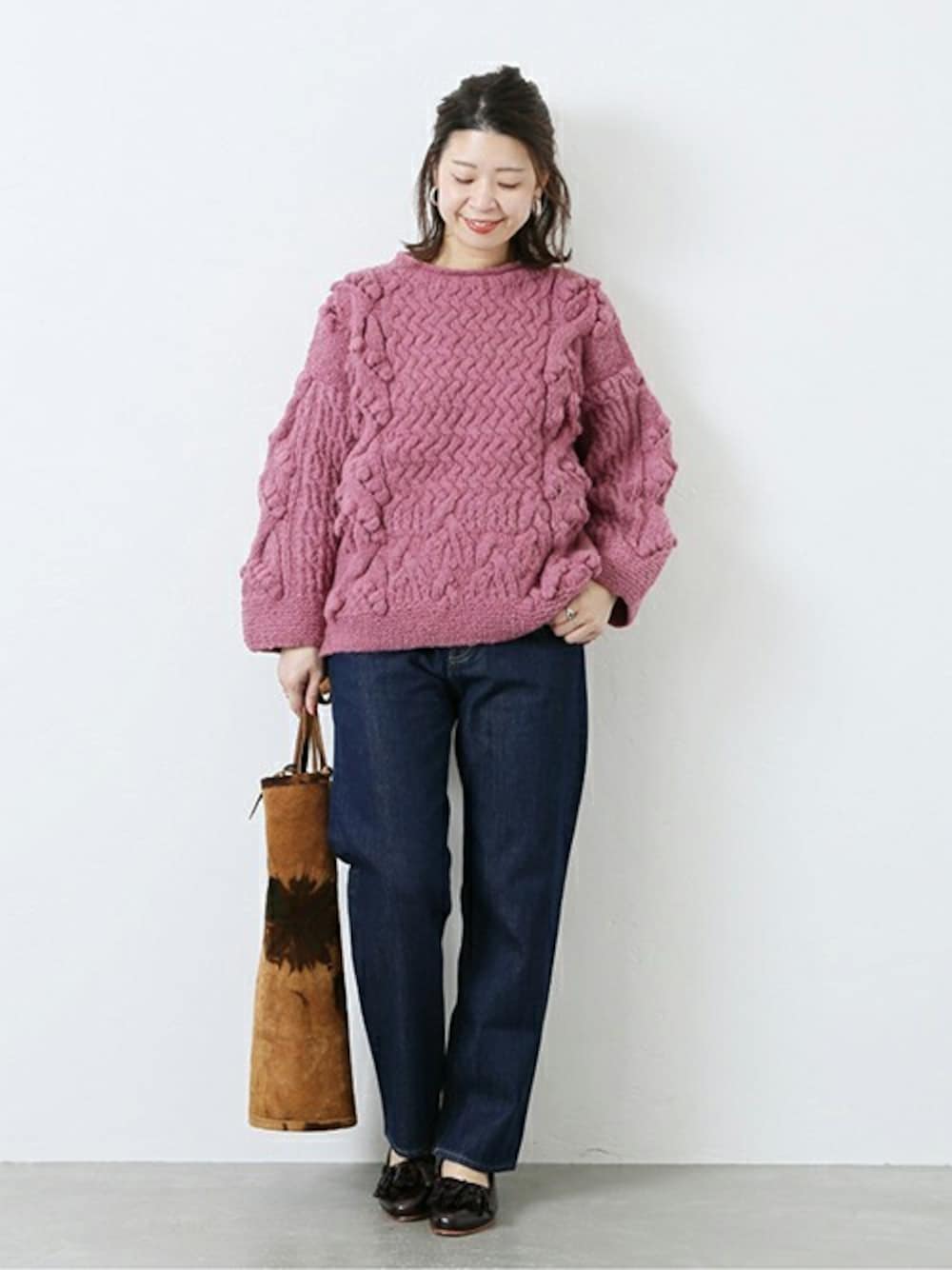 グレープアランプルオーバー ローゲージでアラン柄を編んだ温もりを感じるニット。トレンドのピンクを合わせることで旬なスタイルに仕上がります。