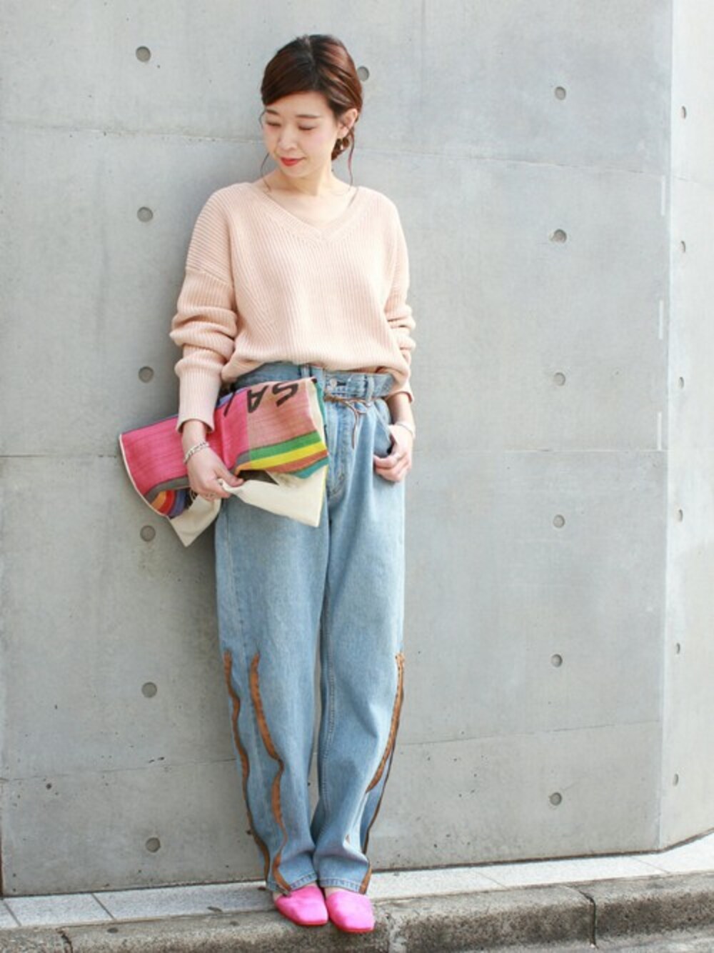 春らしいピンクのニットにデザインパンツでラフに合わせたスタイリングに。