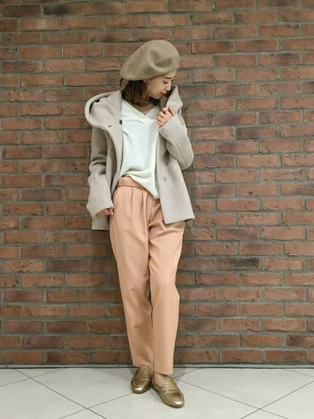 毎度ご好評頂いているテーパードパンツの新作を使用したコーディネートです。ペールトーンのワントーンでまとめて待ち遠しい春の雰囲気に。