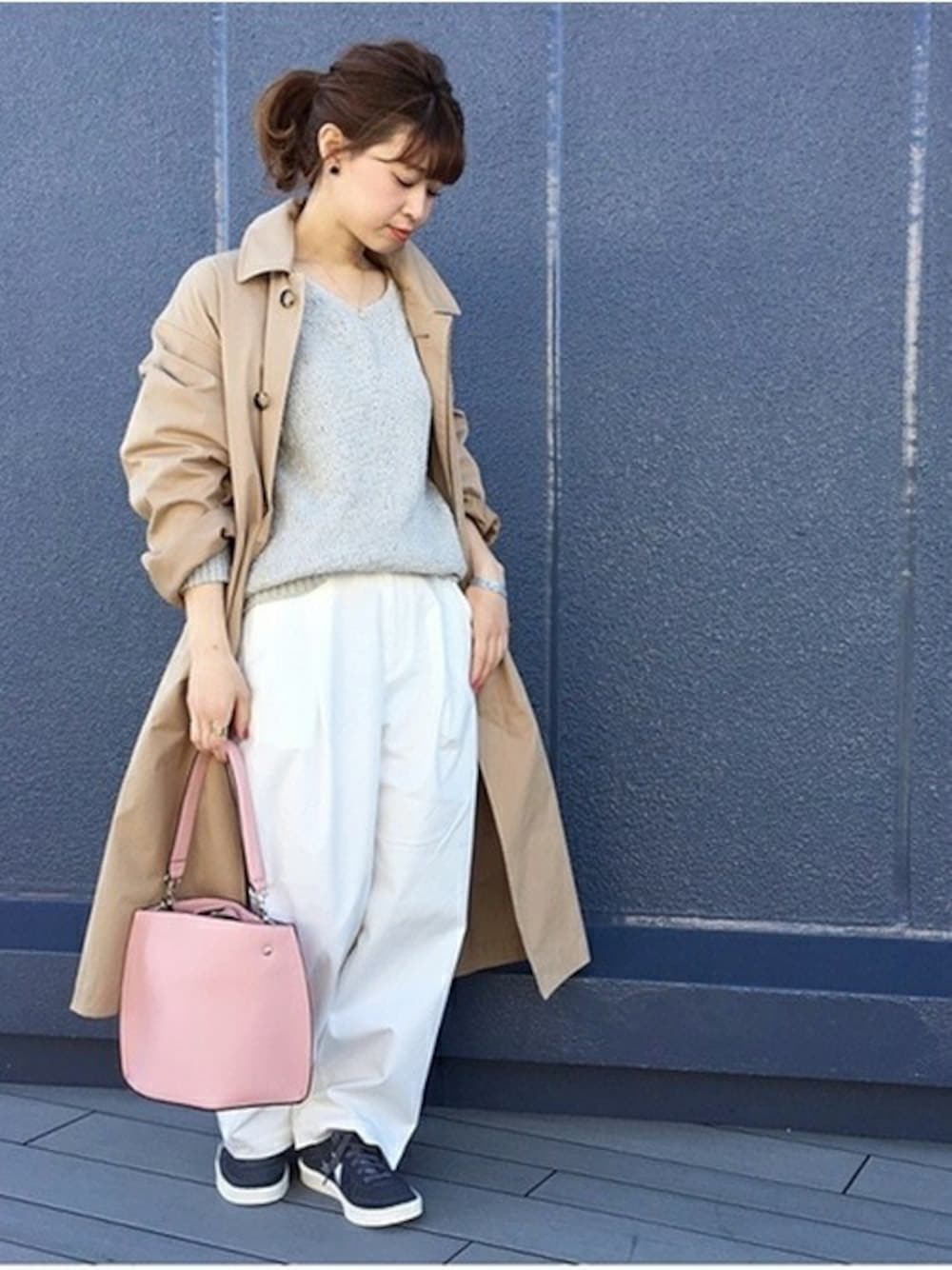 さらりと羽織りやすいトレンチコートをメインにスタイリング。小物にピンクを入れて女性らしく仕上げました。