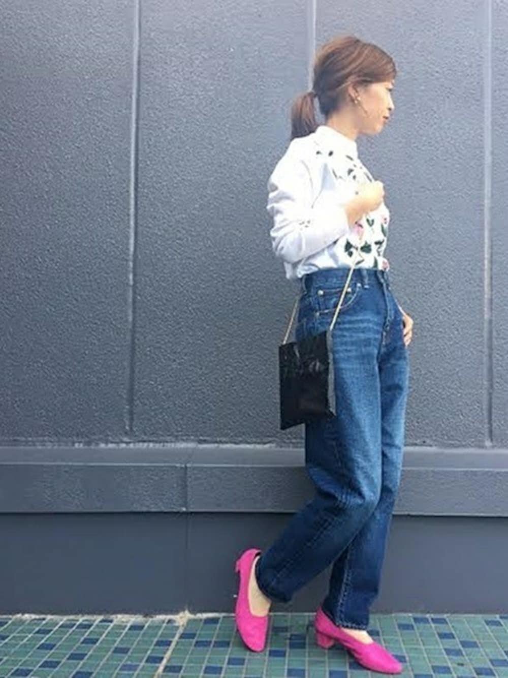 足元にパッと目を惹くカラーのパンプスを合わせて。 今季大注目のピンクをキーカラーにした春らしいコーディネートです。