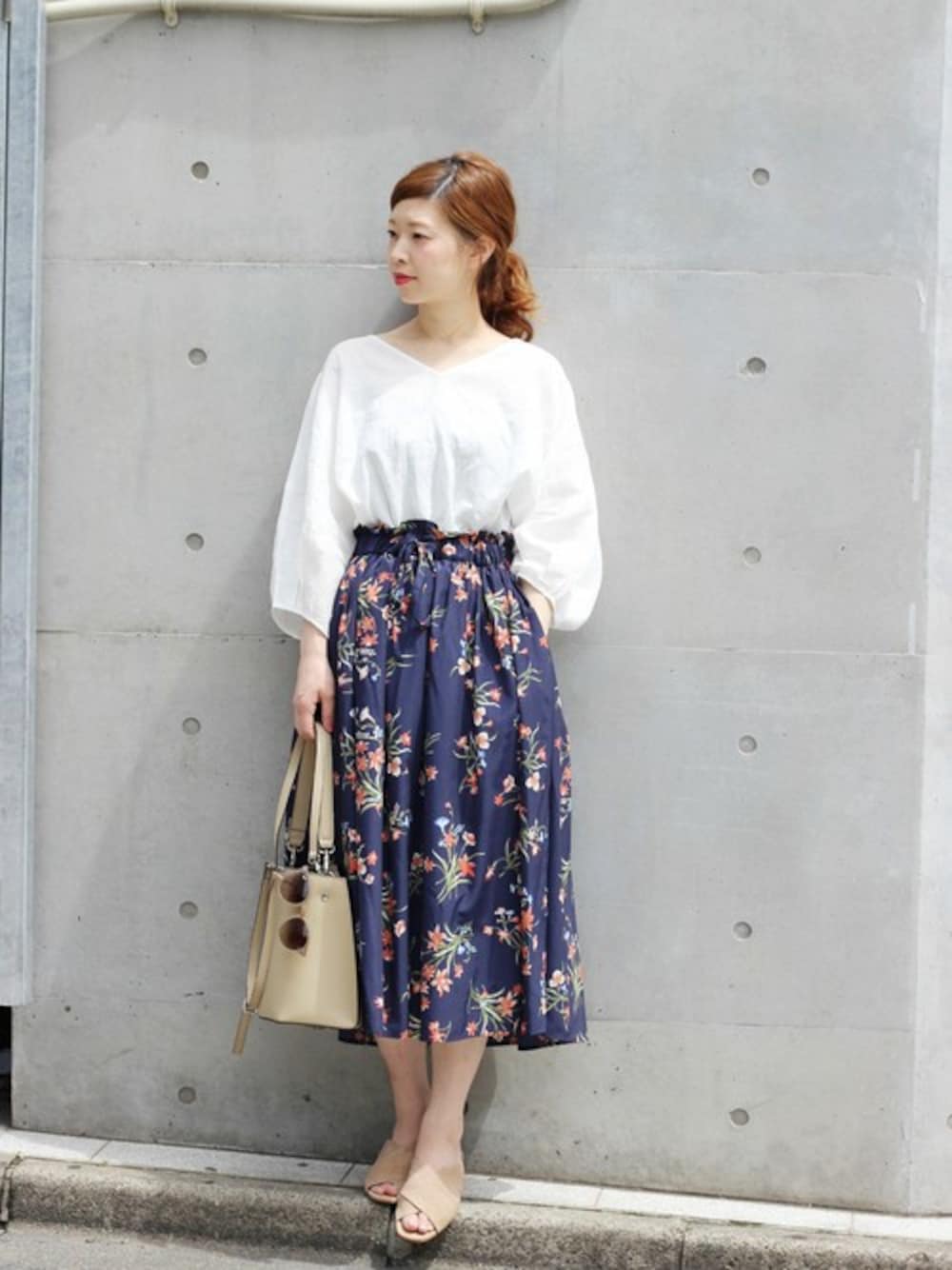 上品な印象の白ブラウスをトレンドの花柄スカートで。 小物をベージュでまとめて女性らしいスタイルです!