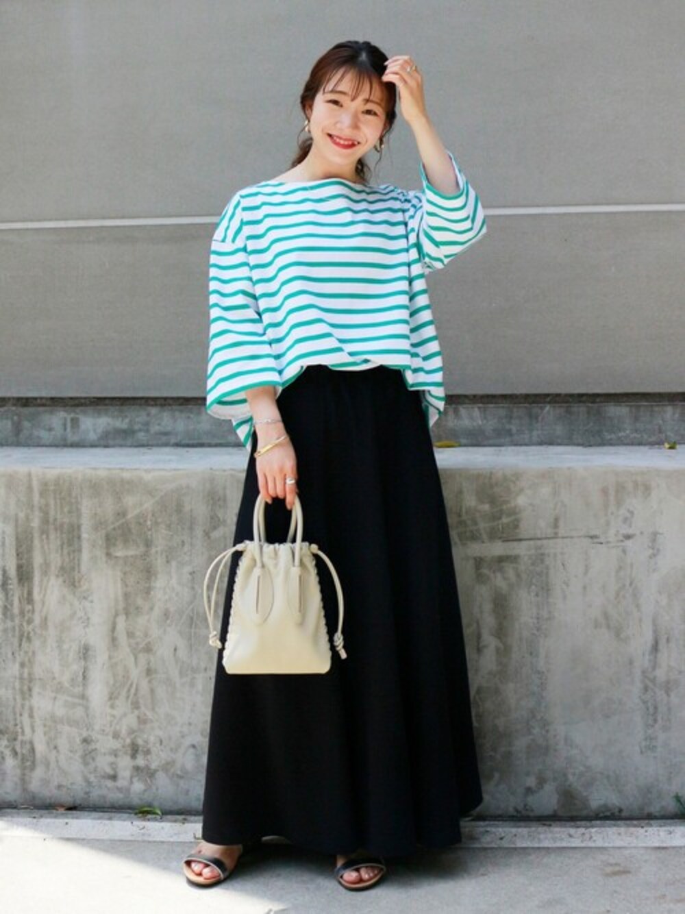 Leminor/ルミノア】 別注ワイドボーダーT 毎年大人気のルミノアから完全別注したオリジナルボーダーカットソーが入荷しました! 夏ははもちろん秋まで使える七分袖で、微フレアのゆったりした袖が今っぽい一枚です。 私はスウェット地のスカートとリラックスした合わせにしました。 前だけボトムスにインすることでスッキリとした印象に◎ バッグは小さめでサンダルは華奢な物にする事で、楽チンスタイルでも綺麗目になるのでオススメです。 明るいグリーンが綺麗なカラーで着映えします! サイズ感:全体的にゆったりめ 素材感:しっかりとした綿素材で透けません。 着心地:全体的にゆったりとしていますが、ややボートネックで程よく首が開いているのでスッキリと着て頂けます。
