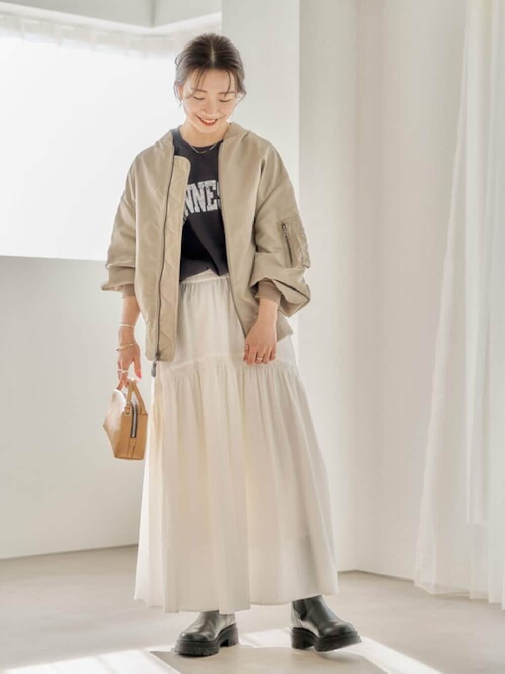 ■Reversible MA-1 リバーシブルで着こなしの幅が広がるブルゾン。 程良い光沢があり、カジュアルな中にも上品さもあります。 とても軽く着やすいので、今の時期はニットで、春はTシャツやブラウスに羽織っても◎ ●骨格/ストレート ●パーソナルカラー/イエベ春 ●普段サイズ/S サイズ感:腕周りもゆったりしているのでニットシーズンから活躍します。 素材感:軽めの素材で、光沢があります。 着心地:リバーシブルで着用すると雰囲気が変化するので、スタイリングに合わせて楽しんで頂けます。 ■シュリンクコットンギャザースカート 清涼感のある白いスカートはぽこぽことした表情のある素材感が特徴◎ ウエストはゴム仕様ですがサイズ展開もあるのが嬉しいポイント。 1枚あれば春先や夏に大活躍すること間違いなし! 女性らしいスカートなので、カジュアルなМA‐1と合わせてスタイリング。 サイズ感:ウエストはゴム仕様で、長めの着丈です。 素材感:凹凸のあるポコポコした素材です。 着心地:涼しげな素材で穿くだけで清涼感のあるスカートです。 ※ あくまでも個人の感想です。 Instagram➤makoto__kubo こちらもフォローしてみてください◎