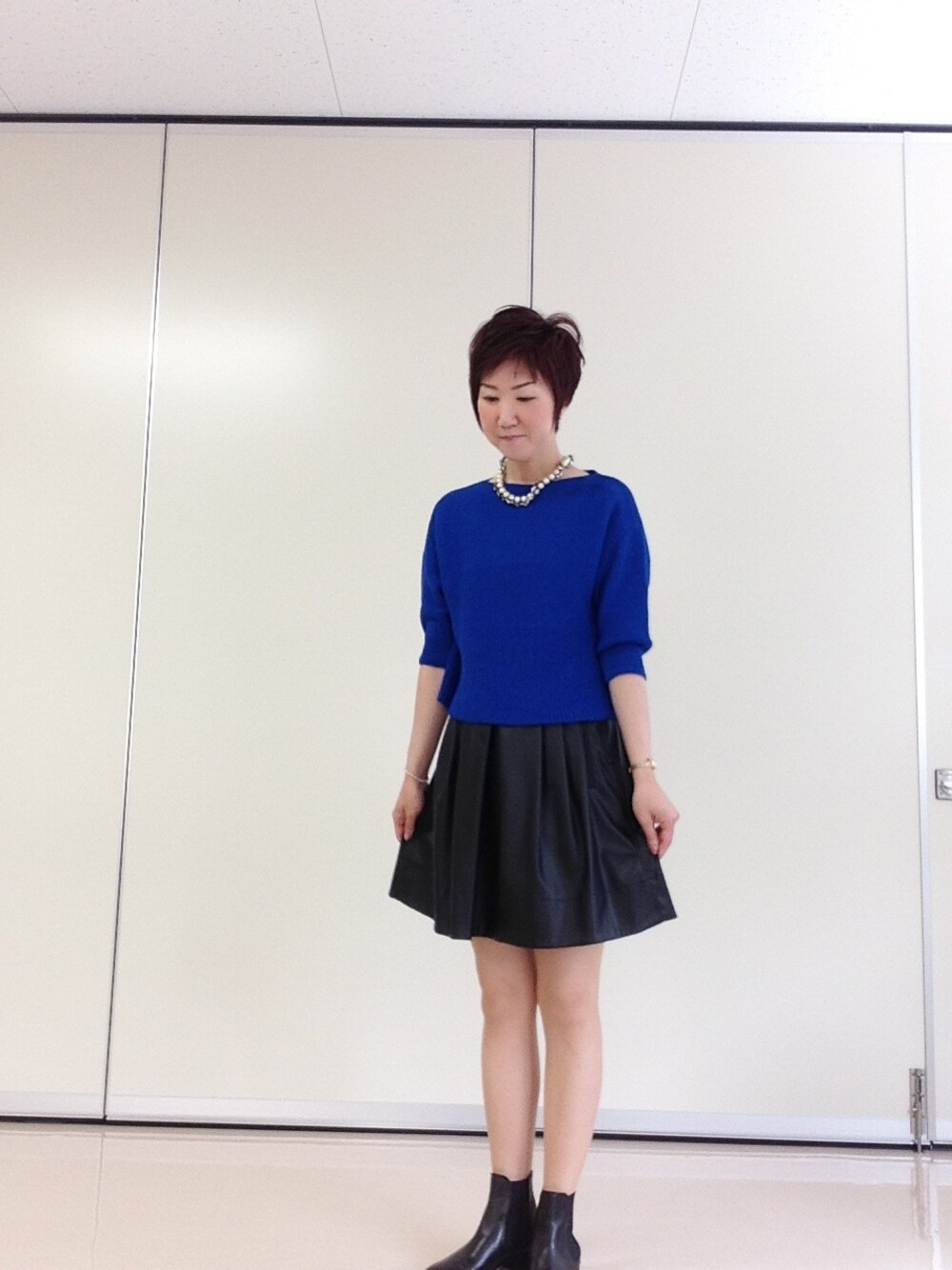 キレイな青ニットに黒のフレアスカートにしてみました。ブーツはショート丈のサイドゴア。このスカートは色々使えて便利です♪