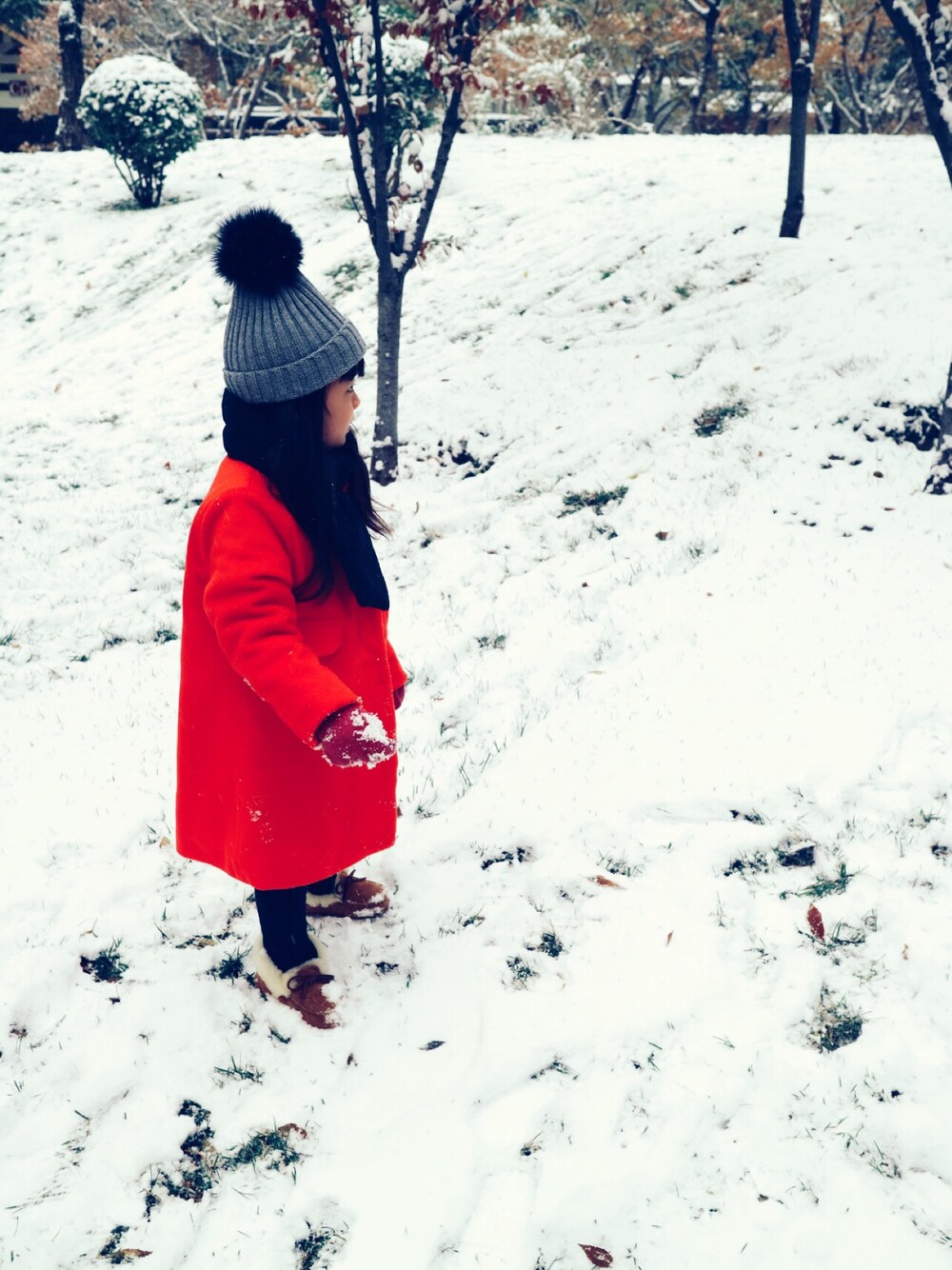 抢眼红色,黑色和灰色为基础色,栗色UGG让整体更柔和