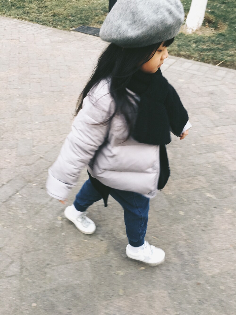 グレー系のダウンジャケット/コート、ホワイト系のスニーカー、ブラック系のネックウォーマー/スヌードを着用したキッズの冬コーディネートの1枚目の写真