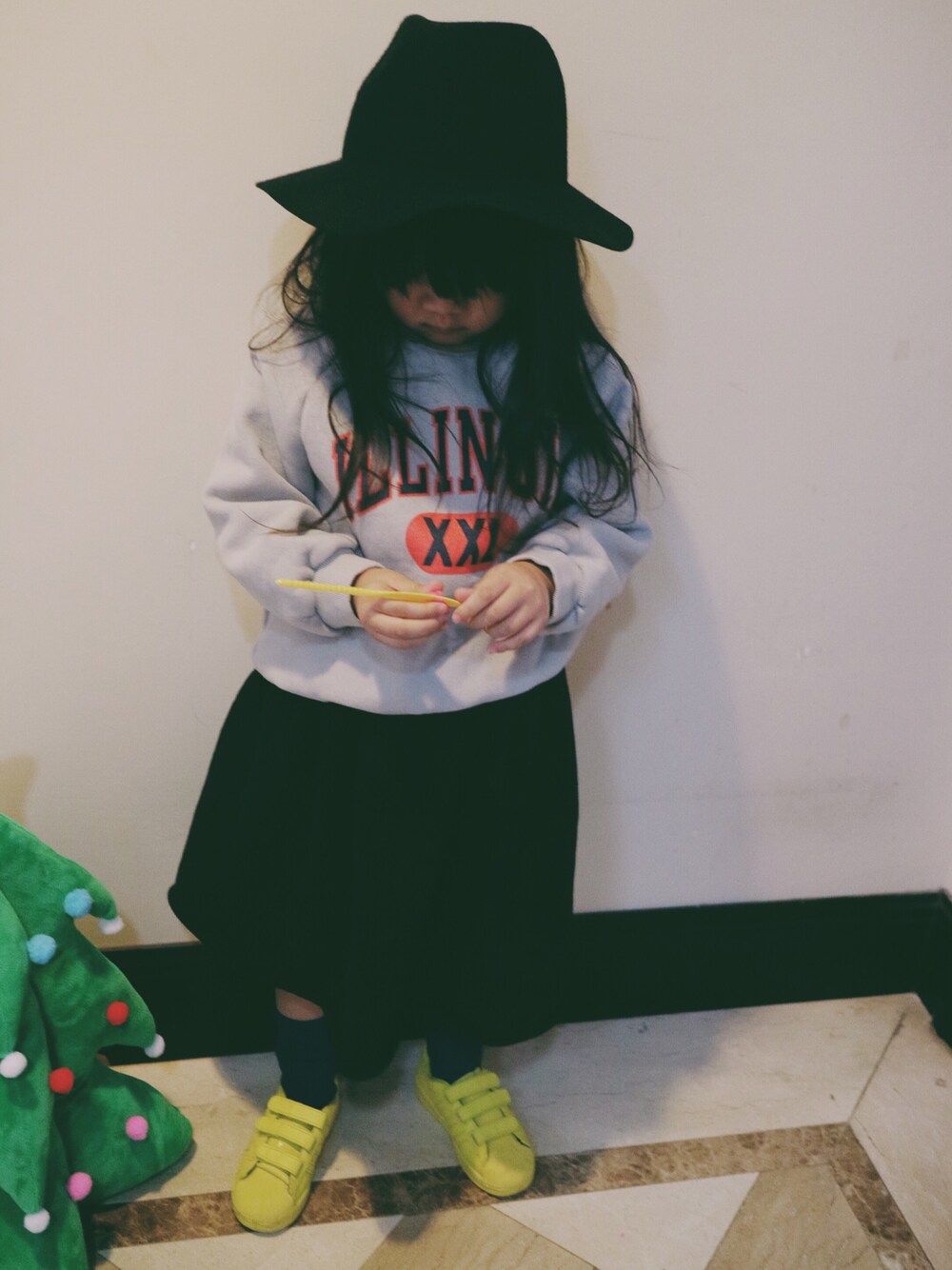 グレー系のパーカー、イエロー系のスニーカー、ブラック系のハットを着用したキッズの冬コーディネートの1枚目の写真