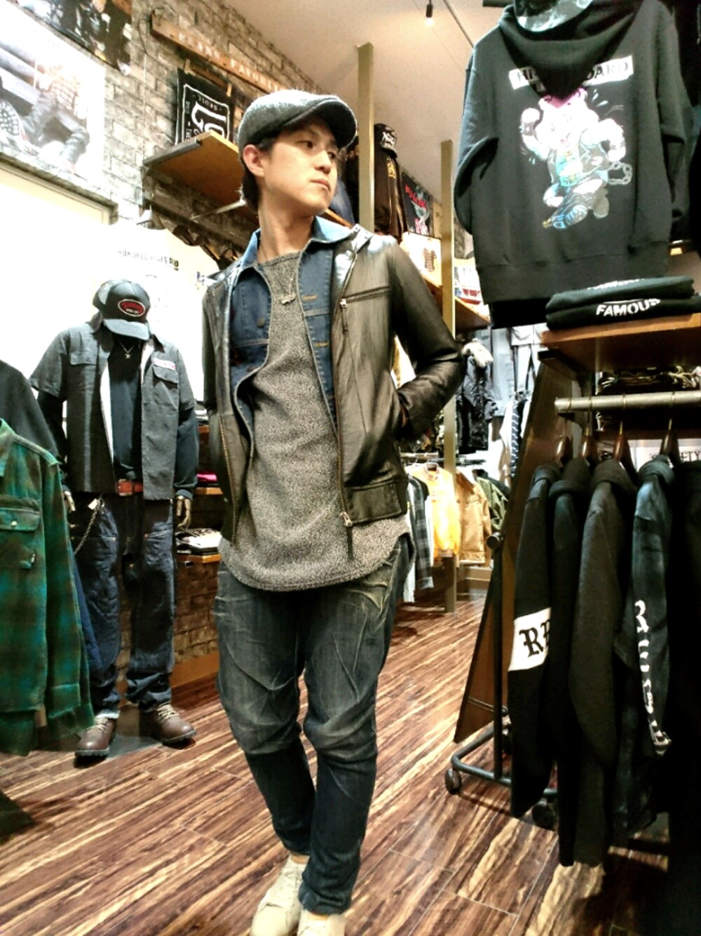 閲覧有難うございますっ! 昨日撮影忘れてましたっ(>_<) 革ジャンの中にGジャンを入れました。 アウターonアウターって 無謀で無意味ですが、 お洒落ですよね! インナーはお決まりのロング丈。 靴は重厚なブーツじゃなく ローカットのレザースニーカーです。