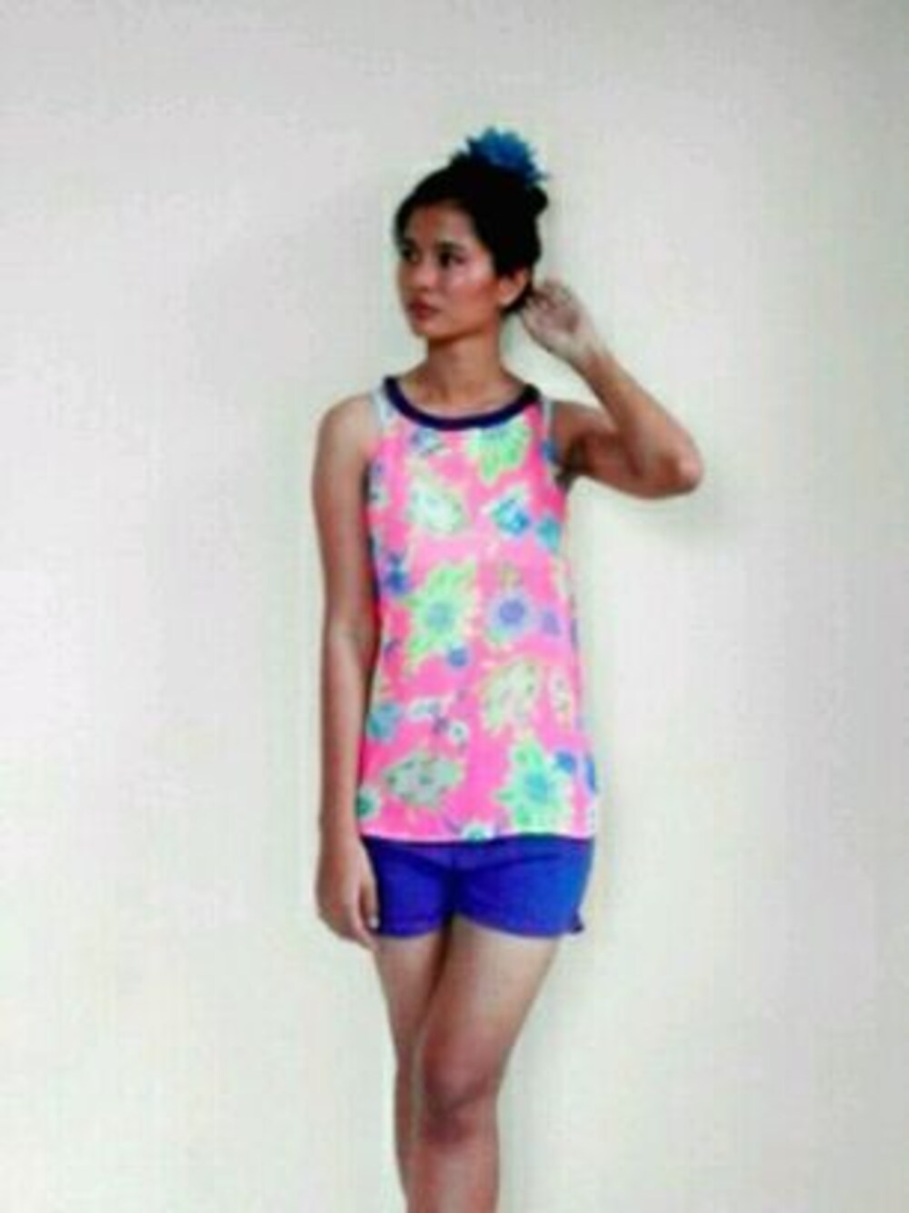 Floral printed chiffon pink top matched with short blue short are cool for the summer! Also perfect combination for beachwear! Let the sea and sun envy you (;