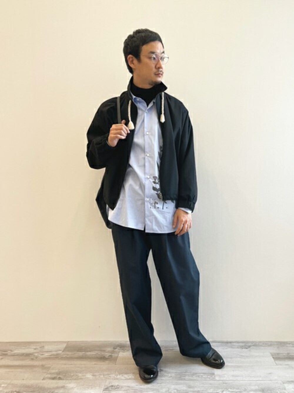 中に着たタートルネックのニットはどんな服にも合わせられる、この冬必須の一枚。 裾にデザインが入っているので、単体で着てもコーデが決まります。 men's FUDGEにも掲載されています! 綺麗にまとまったコーディネートに、ロープのようなドローコードがついた遊び心のあるブルゾンを合わせ、無難な仕上がりにならないようにしました。