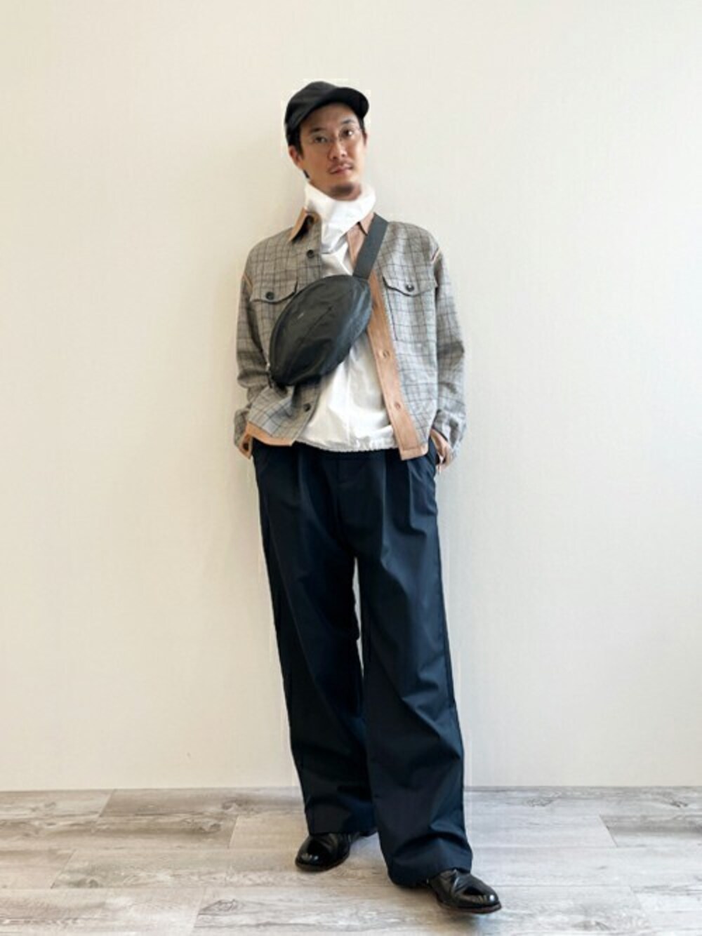 全体的にラフなコーデに。 カジュアルになりすぎないようにドレスシューズを合せました。 ボディバッグはペーパーレザーでとても軽いのでオススメです! 中に着ているハイネックはシャツ生地ですが、着てみると思っている以上にあったかく、渋谷パルコでのポップアップで売り切れた大人気のアイテム!