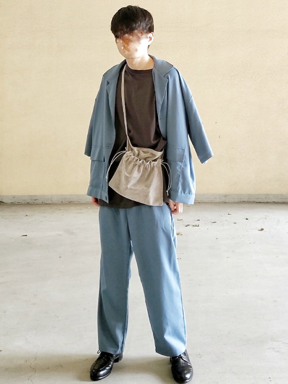 いつもいいね、saveありがとうございます ブルーのセットアップを黒のTシャツと合わせました シャツは肩掛けしています