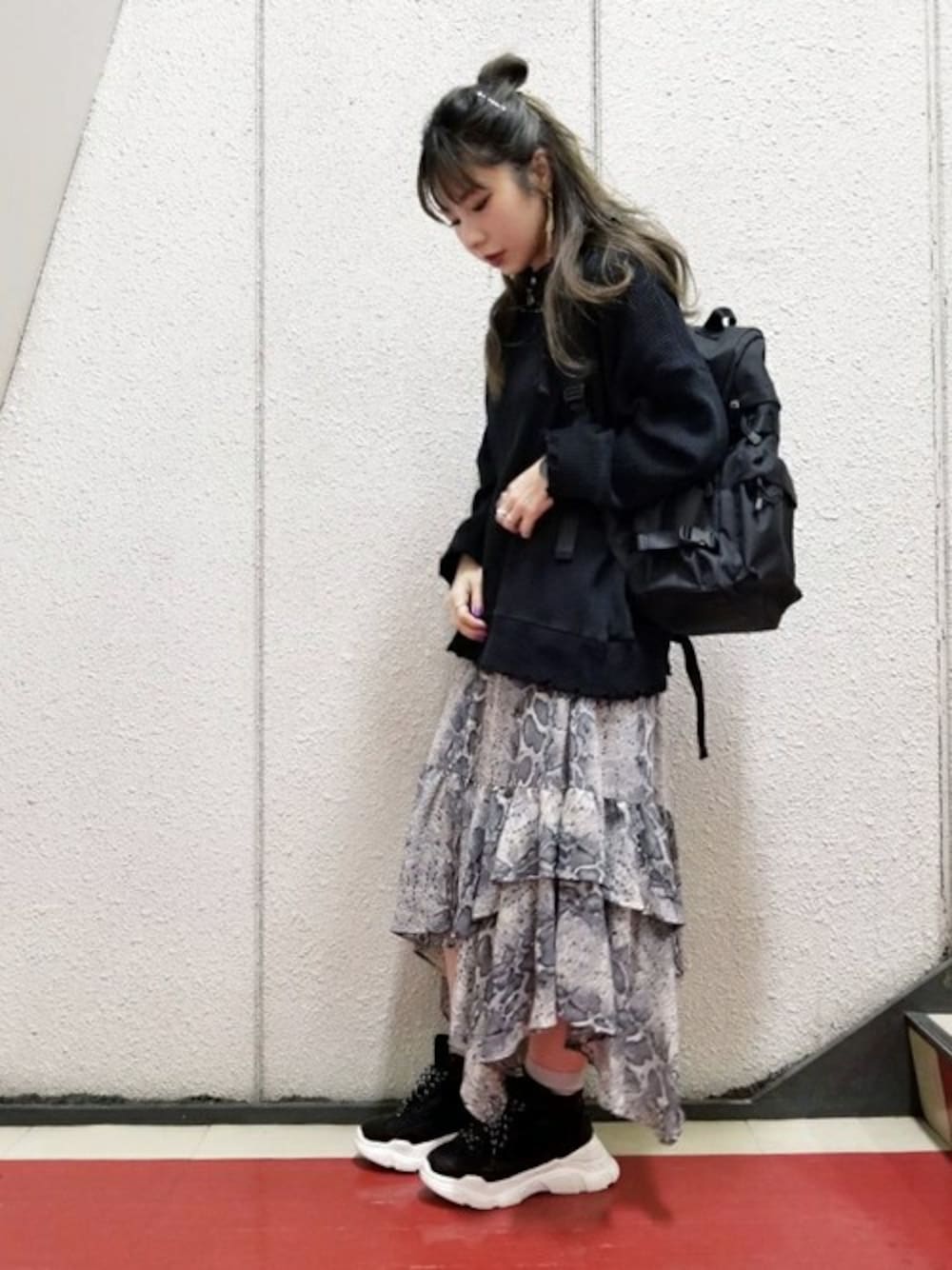 パイソン柄をポイントに全体をモノトーンコーデ♪ スニーカーやバックパックでスポーツ要素もプラスし今年らしさを!