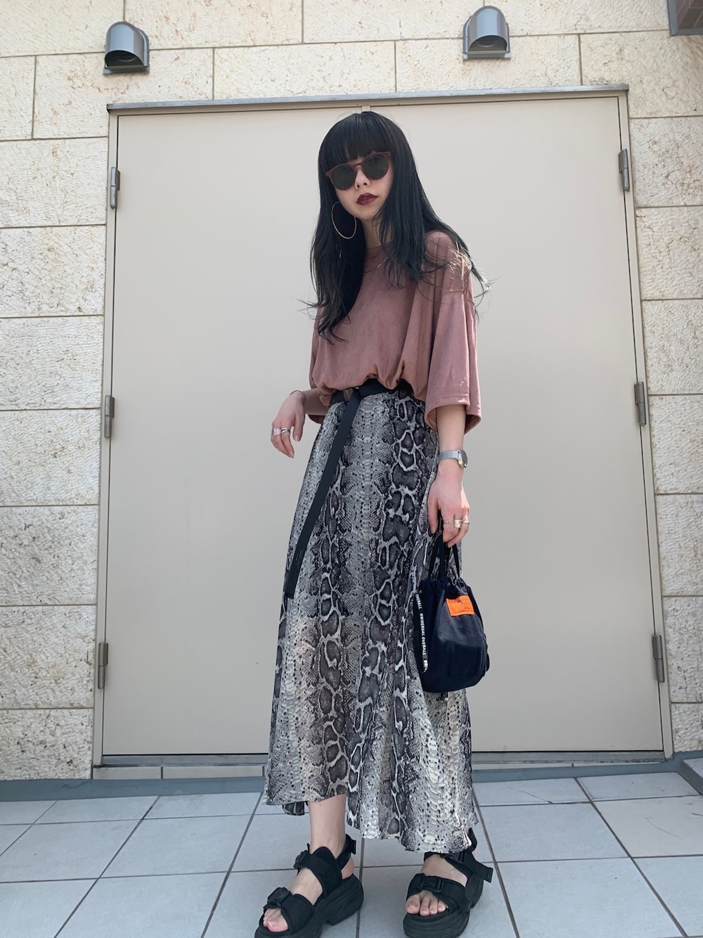 JEANASISのくすみピンクは甘過ぎず大人っぽく着れます♡ 私はモードに着たかったので、 パイソン柄のスカートをチョイス!