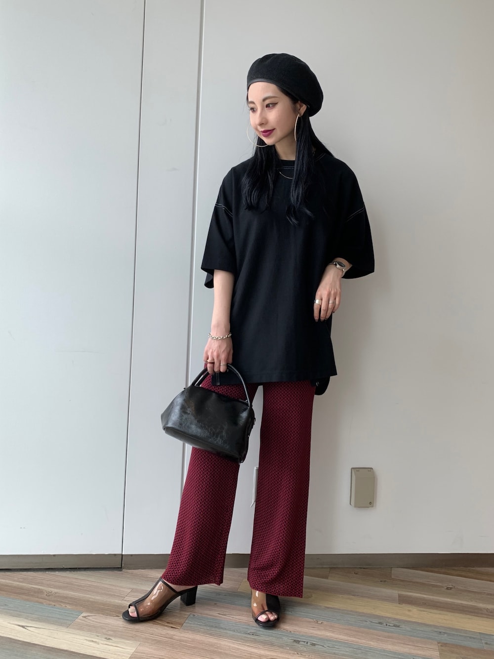 ビッグTシャツで楽ちんカジュアルコーデ★ モードな赤の柄パンツでしっかりお洒落感◎ メンズ過ぎないようヒールで合わせたのもポイント❤︎