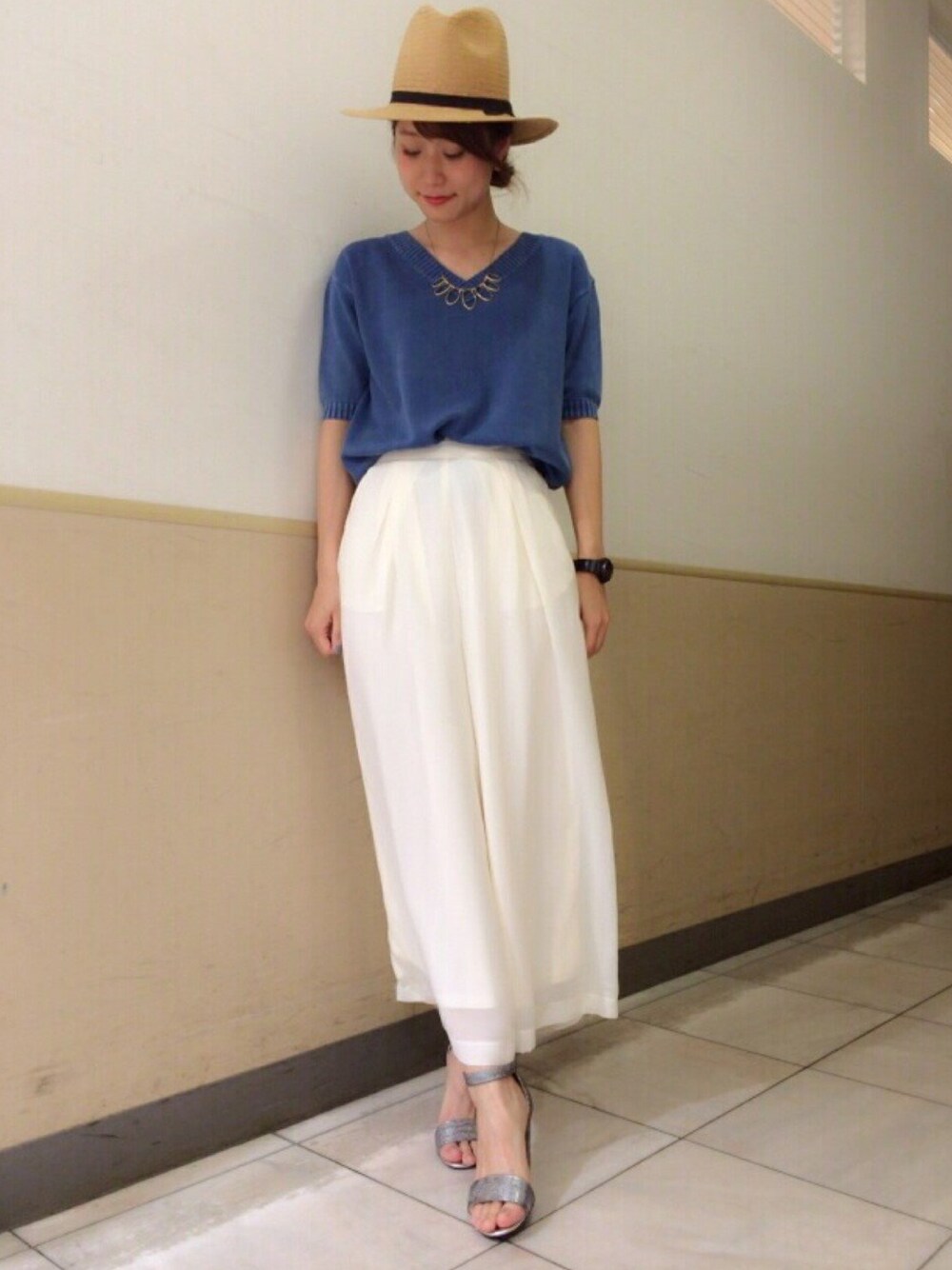 新作のブルーのトップスを白で 合わせたクリーンなコーディネート。
