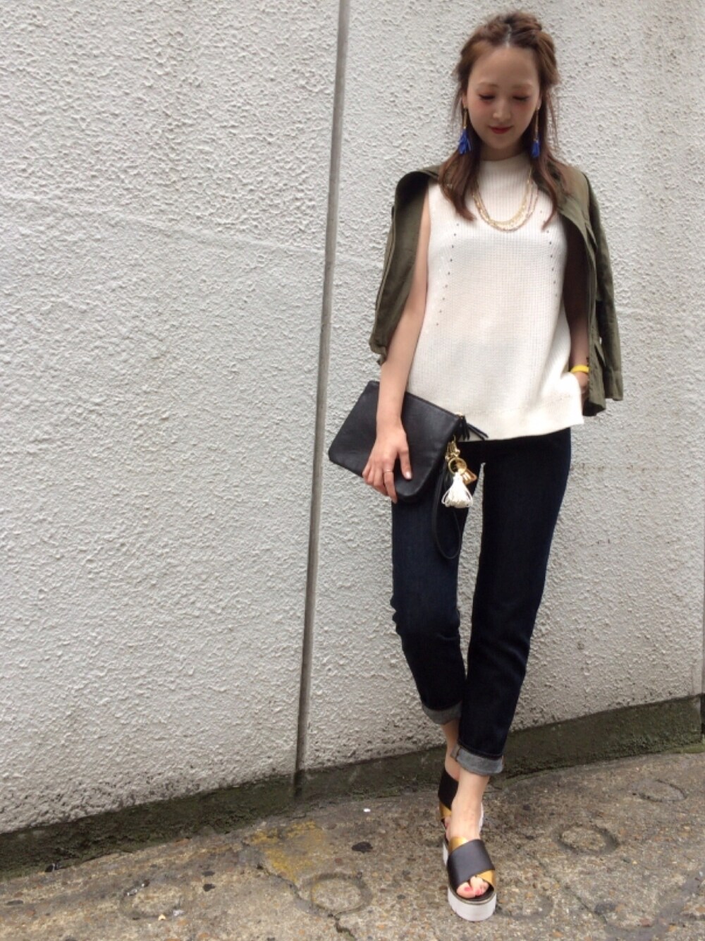 大人気のベストを使ったコーディネート。 モノトーンに、トレンドカーキアイテム を合わせて、少しカジュアルに。