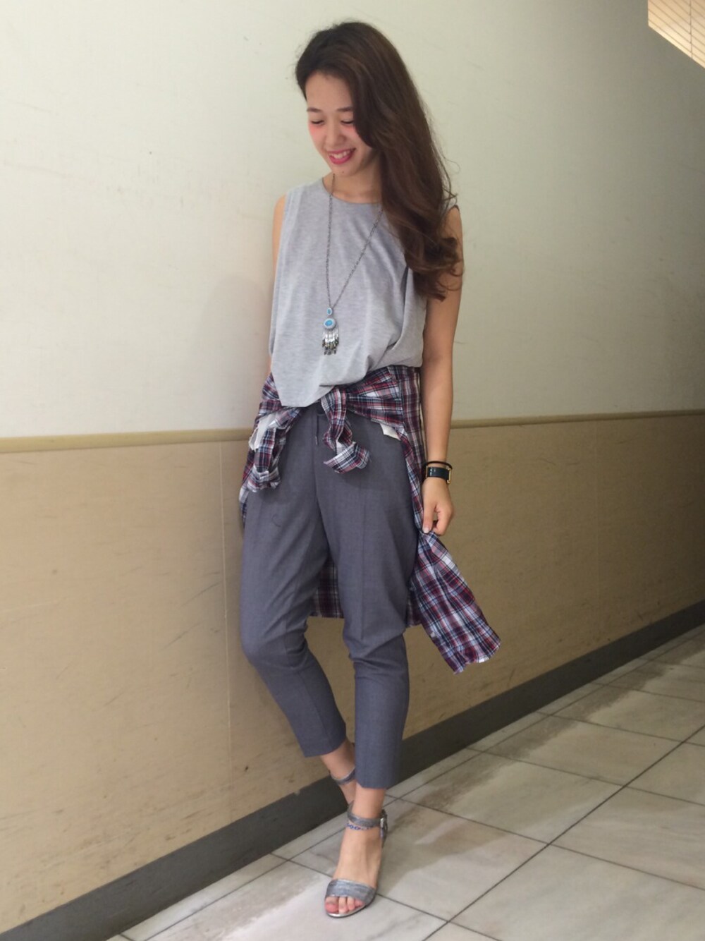 グレーのグラデーションコーデに チェックシャツで差し色を😋