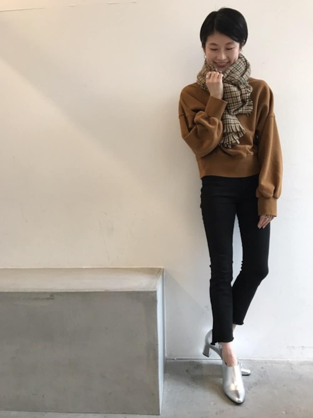 上半身にボリュームをもたせた スタイルアップコーデ☆ 落ち着いたブラウンに シルバーのブーティを合わせるのが◎