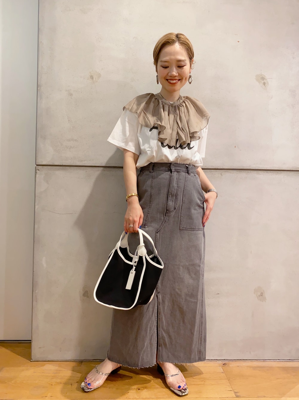 nakamuのスカート「ヴィンテージライクデニムスカート」を使ったコーディネート