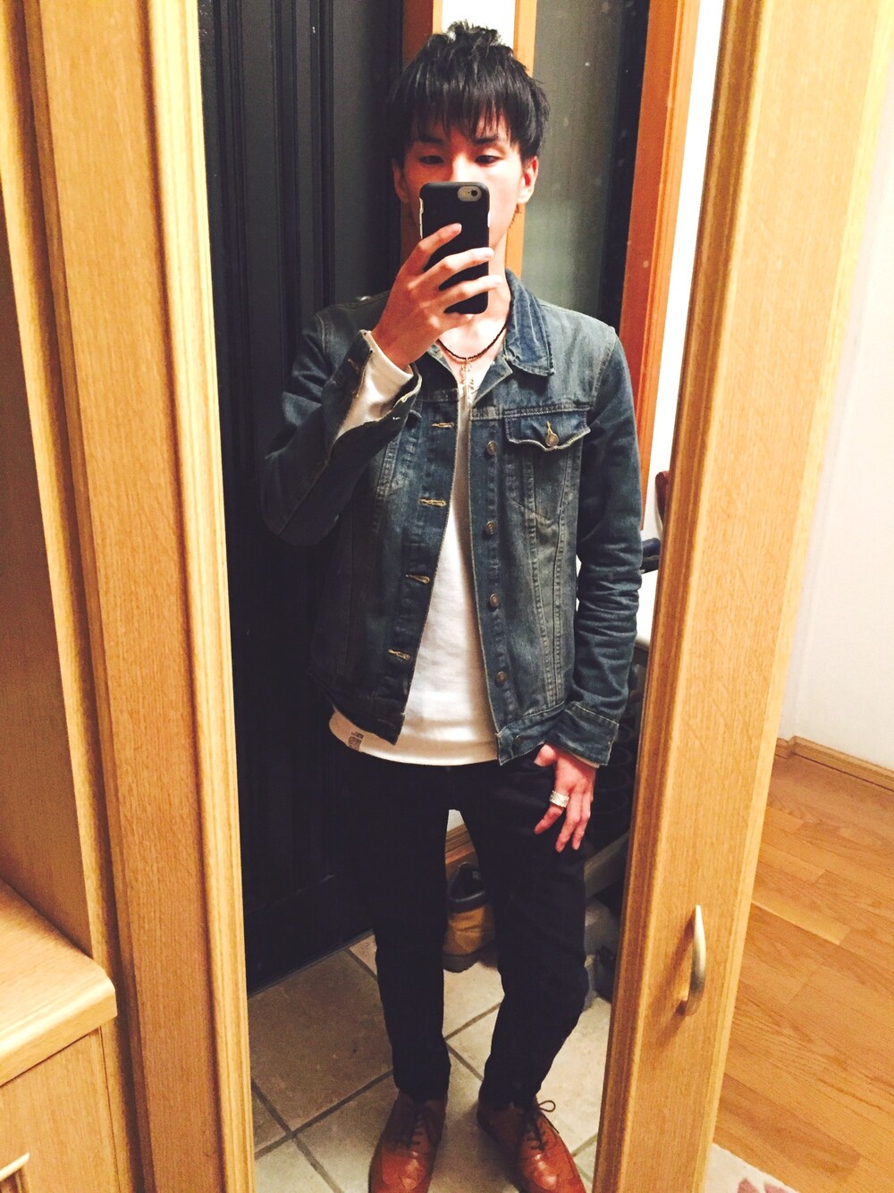 今日急に寒いですね❄️😇 外出たらGジャン着てる人多くて被りまくりました。笑 その中で個性出そうとして茶色の革靴で色味をまとめました! インナー無地の白Tじゃなくて、黒のロックTにして合わせてみたいな〜。中のインパクト欲しい。(持ってないw)