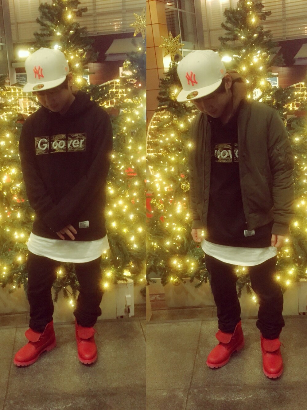 今日はクリスマスver.ということでイルミネーションの前で撮りました🎅🎄 そして、赤のTimberlandを初めて履きました!! 抜群の存在感で服にメリハリがつきました! ma-1やキャップなどでストリート感を出してみました😎😎