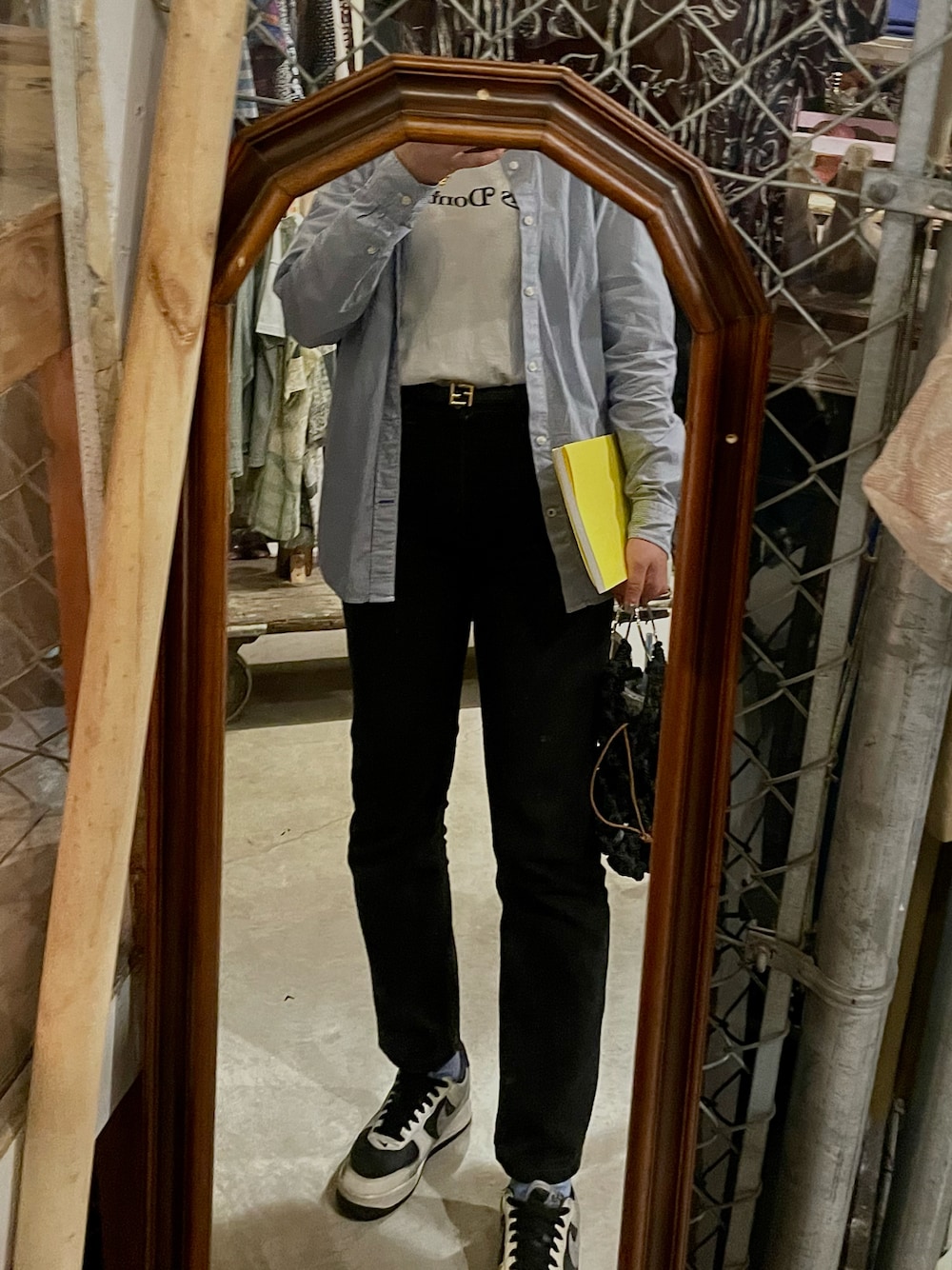 . ストライプのシャツ流行ってるので 何年か前に100円でゲットした GAPの古着シャツ(ふだんは仕事着) みえるとこにロゴある服をなかに着たいよね ってことでhumanmade × GDC のTシャツを シャツと靴下の色を合わせてるのが ポイントってほどでもないですがポイント そういえば、リーバイス505も古着 白黒水色の3色コーデです