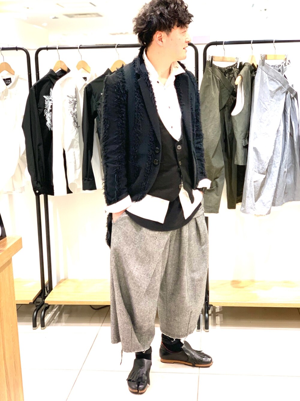 今日は胸元ゆったりなベストと燕尾服ジャケットのコーディネート。 シャツの面積が大きいので、モードすぎない様に・・ 重ね着と猫背は健在です。