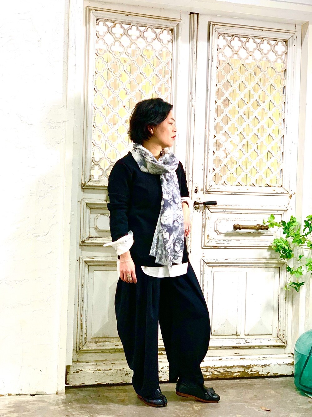 楽しむ事を大前提に・・ モノトーンだけど、ストールでアクセントと、素材・ステッチ・ドレープで動きをつけた着こなし。 毎日の気分を少しでも上げるために・・