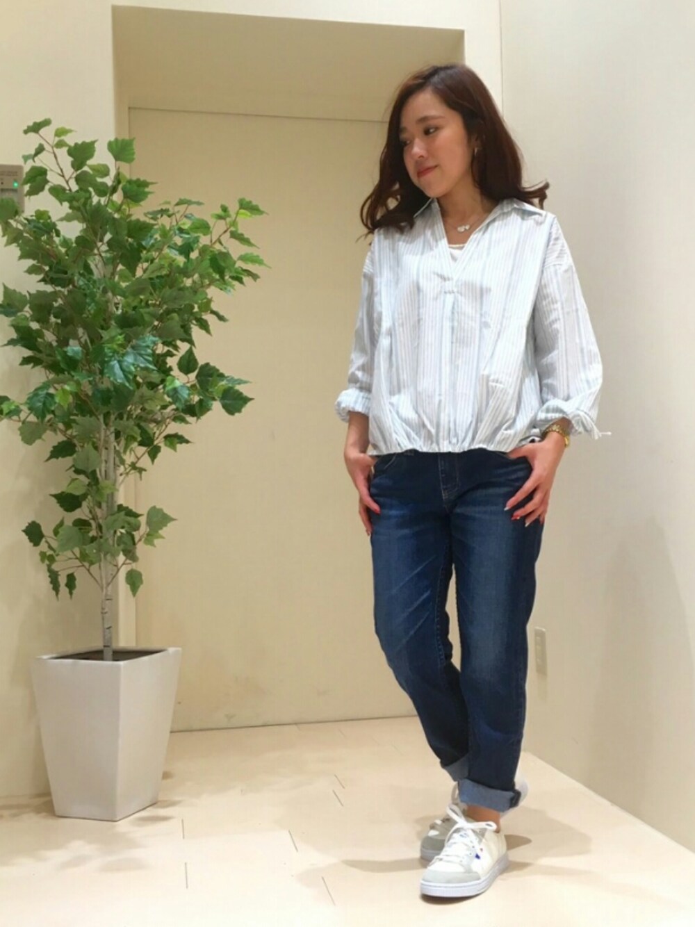 プルオーバータイプのブラウスにデニムを合わせたシンプルコーデ。 ほどよい女性らしさがポイントです♪
