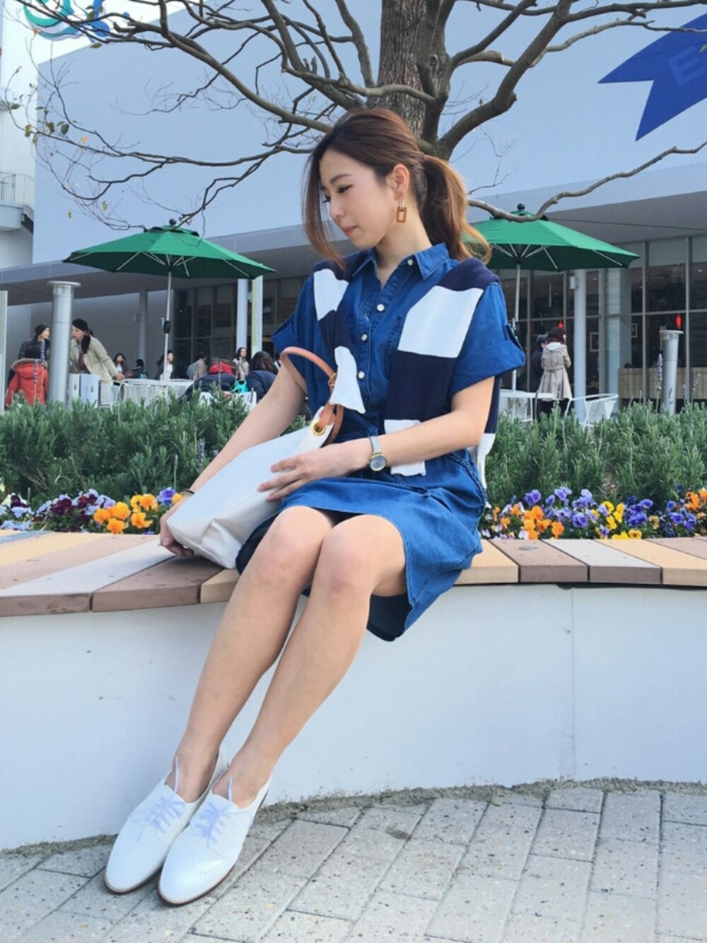 デニムシャツワンピを使ったコーディネートです! 肩からボーダーのニットをかけて、アクセントにしています♪
