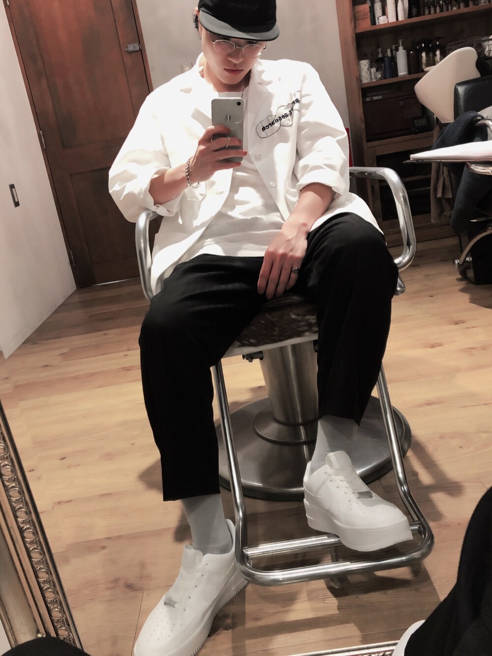白黒になってました。 スニーカーは最近手に入れた エアフォースワン セージ ロー 日本ではレディースの26センチまでしかないのですが、 海外は28センチまであるようで 27.5センチを取り寄せていただきました。 エアフォースの厚底 かわいいですよね!😍