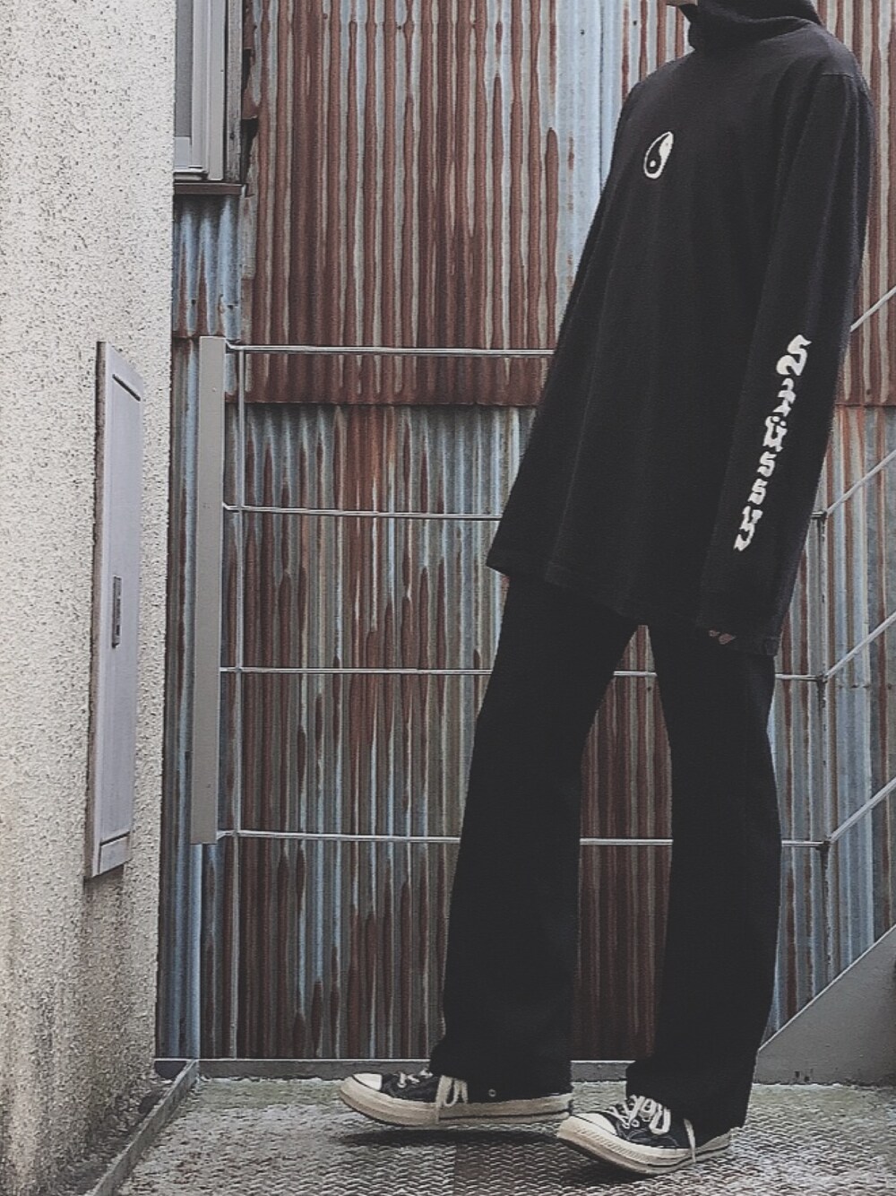 真っ黒コーデ。 メキシコステューシーと ラングラーブーツカットは 高円寺の古着屋で買いました。 ウエスト29で パッツパツで、ピッチピチ でもできるだけ細めの このシルエットにしたかったんだよね😎