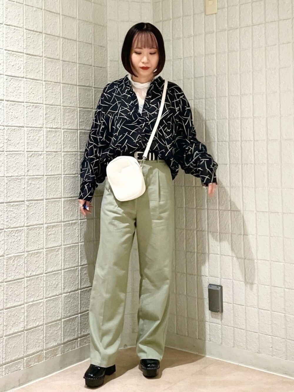 春のモードカジュアルコーデ☆ リアルに購入したモードシャツの色違いコーデ! バンドカラーなので肩周りがスッキリ見えます◎